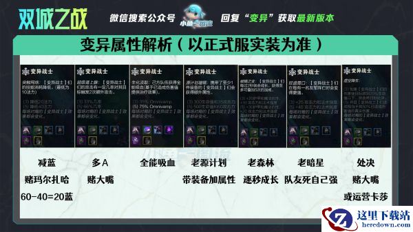变异属性解析:变异一共有7种随机开局属性,减蓝、多A、全能吸血、老源计划、老森林、老暗星、处决,其中减蓝最适合赌玛尔扎哈,因为5变异的蚂蚱,只有20的蓝条,几乎无缝法术机关枪,多A和处决适合玩赌大嘴,处决适合玩大嘴或卡莎,这期只介绍赌大嘴,那我们如果要开局确定变异属性,可以开局放一张卡萨丁扔上去,看变异属性决定玩哪套。
