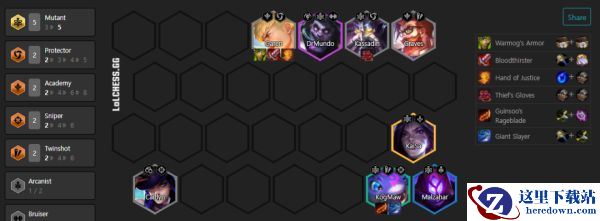 3-4阶段:只要这套牌出现2-3个三星,就不要继续赌,克格莫不3没关系,因为你质量已经够了,最重要的就是升6把3变异点出来,这个变异可以是玛尔扎哈也可以是蒙多。也可以是变异转的盖伦、格雷福斯,但中期克格莫旁边的吃钩位一定要有,这赛季是有机器人的,且这套打刺客很难打,一套赌阵容如果中期主C被拉,那轮基本就输,赌阵容不仅要赌成,还要注意中期站位保证后期容错