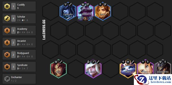 这套阵容与上面大头思路略微不同,阵容更是小羁绊搭配,利用小羁绊强度,再辅以海克斯强化与风女技能的控制和续航,阵容强度非常高。