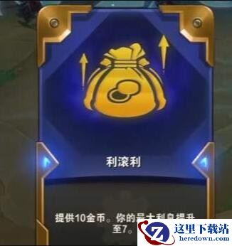 利滚利强化效果如下图所示,选择后将提供10金币,同时最大利息将提升至7。也就是说我那家选择这个强化后,通过每回合结算的利息数量将进一步提升,70利息给7块钱,对于连胜攒钱有很大帮助。
