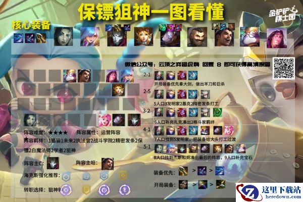 狙神前期的过渡可以选择的有两套阵容,一套是精密发明家,另外一套就是斗士,利用斗士前期超强的坦度搭配可以直接直接拉到8人口找到阵容。但是这套阵容关键的点就是千万千万不要直接去拿保镖过渡,保镖只有在刺客体系里面才强。