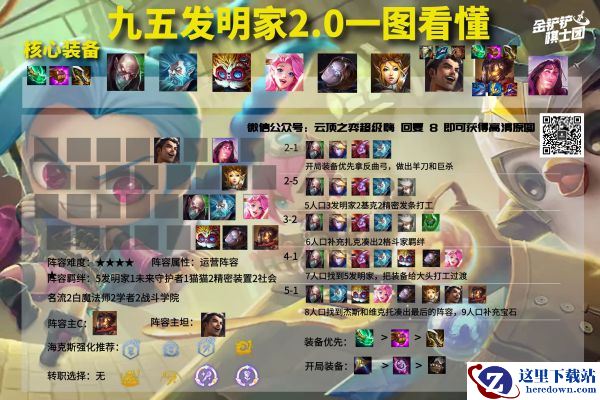 发明家的本质其实就是九五阵容的一个质变,这套阵容在开服之初一直都是T0级别的阵容,但是当前版本赌狗环境的改善,使得发明家在中期并不是特别好过渡,但是前期过渡顺利的情况下,这套阵容依然是版本强势阵容。