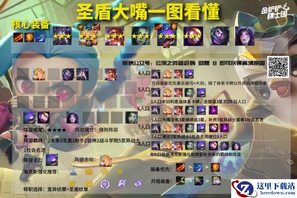 圣盾大嘴其实本质还是叫做圣盾盖伦,前期一定不能优先做大嘴的装备,对于前期战斗力来说3星盖伦的3神装至关重要,这是3、4阶段锁血关键,而后期5阶段大嘴就必须3星,否则阵容没有伤害。这听起来似乎非常难,但是大家只要开局无脑去搜盖伦基本吃分简简单单。