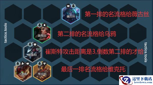 崔斯特的站位问题,崔斯特攻击距离是3格,而绝大部分的法师英雄攻击距离是4格,因此崔斯特需要站在倒数第二排的位置,才不会走动去A人。如果出现了倒数第一排的名流格,那么就需要给维克托/拉克丝站位。名流格子在不同的位置需要给不同的英雄使用,已经在图上给大家标出。切记不要去贪名流格子,非常容易会被别人针对。