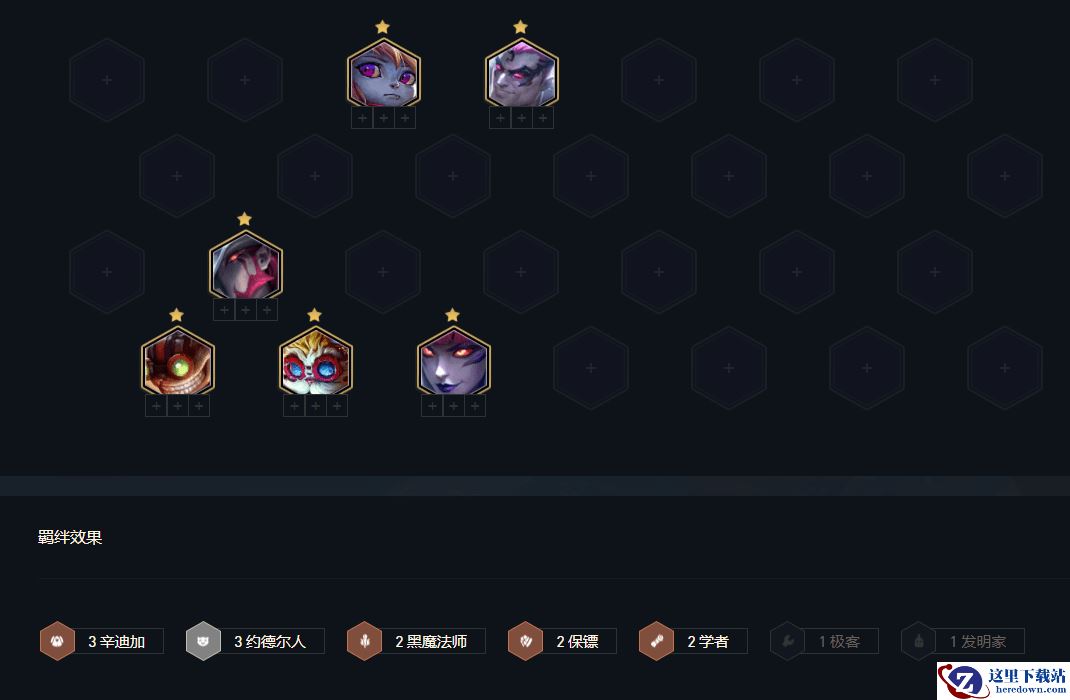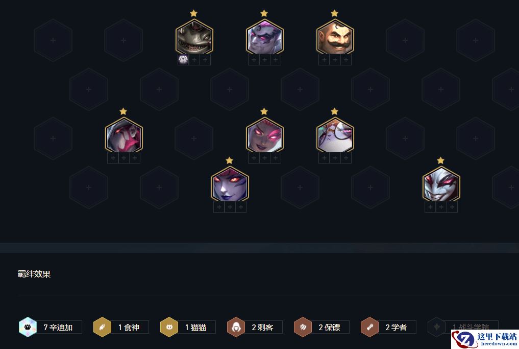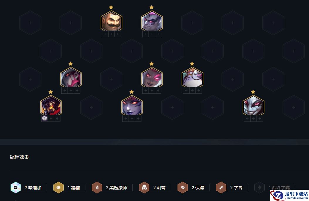 这个阵容成型的一般形态是7辛迪加加2黑魔2刺客2保镖和2学者,其中卡牌位置不要边角,这个位置技能能够打到更多的人,后期卡牌输出已经不足,主要作用是挂鬼书的重伤和真实伤害,主要收割还是依赖于阿卡丽,当然这是7辛迪加的玩法,有时候阿卡丽不来时要如何破局吃分才是这个玩法的核心。