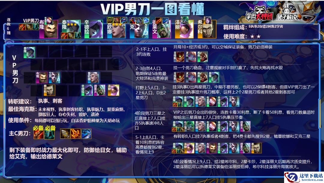 云顶之弈s6.5版本有着全新的羁绊和英雄,并且男刀这个角色依旧非常的强势,今天给大家带来了VIP男刀的一个阵容搭配,那么下面就是具体的内容.