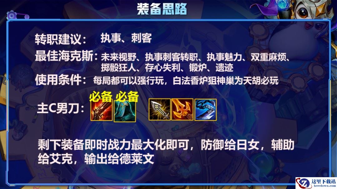 开局抢攻速,2-1不上人口,有3约就上3约,最大化经济,有存心失利等赌狗最佳,或者额外转职,双重麻烦等战力加成最佳,但是不刚需海克斯,基本上都能强行玩。