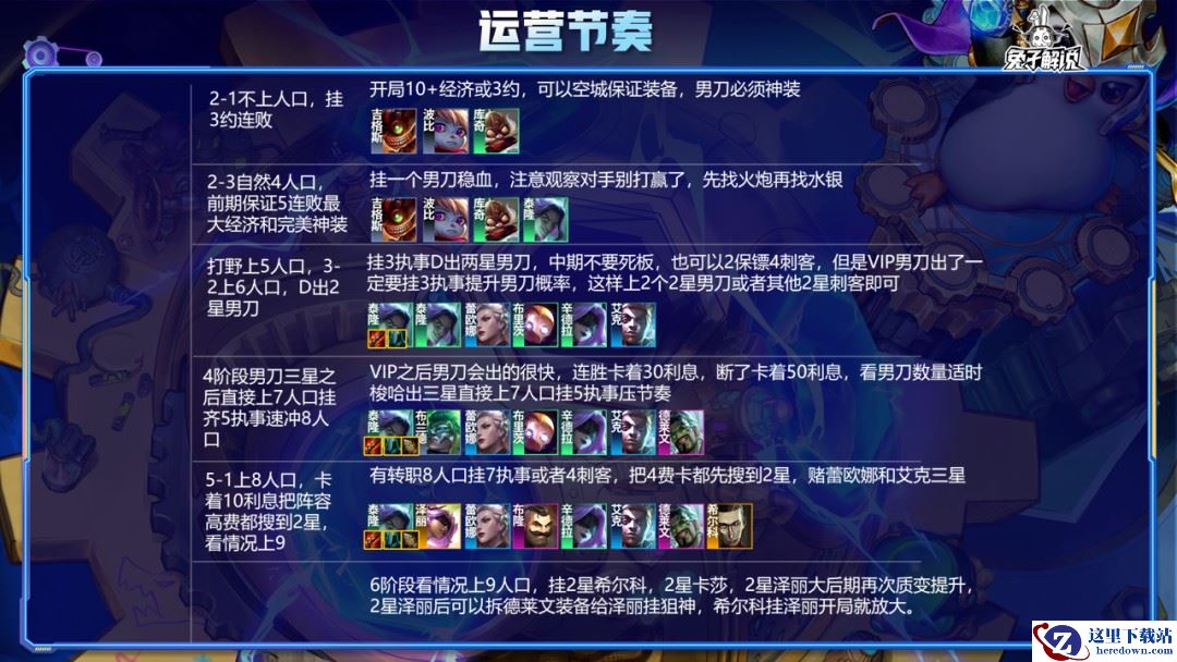 刺客赌狗基本上一致,开局空城完美装备最大化经济,中期快速两星压制,但是因为有VIP增加概率,所以男刀变得特别好D再次加强了阵容,但是羁绊男刀战力加成不如帝国高导致后期基础上限不够高,所以要利用这种加强压制节奏补强高费棋子。