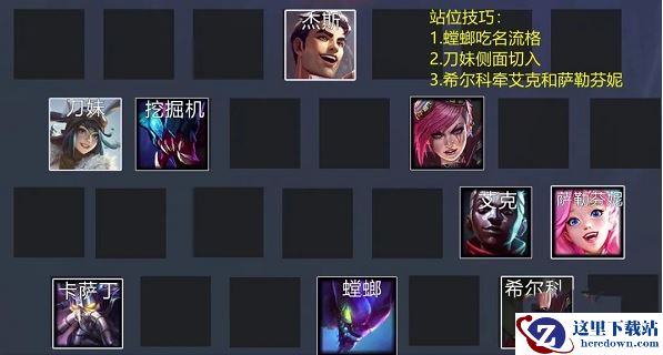 螳螂吃名流格,其他人分散站位。纳尔可以带肉装当前排。