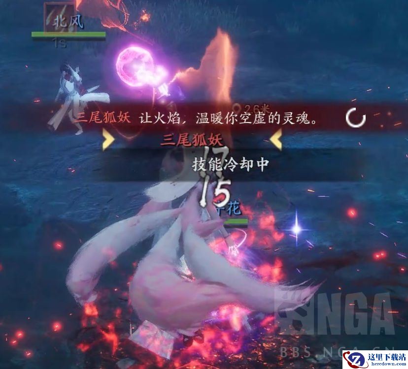 技能3:焚山河,BOSS跳中场读条,读条结束后三段全屏AOE。外场刷新一个鬼火小怪,打掉后会有安全区。