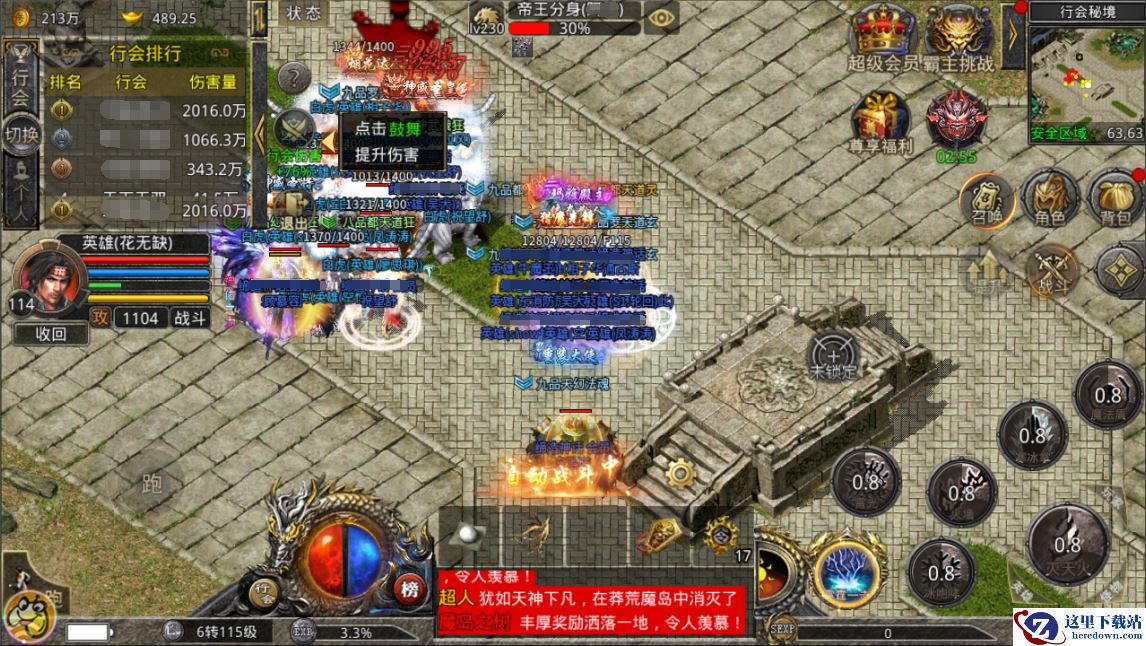 活动开启后,活动时间前建立的行会可以参加,已有行会的角色可进入行会领地,击杀帝王分身,根据行会造成的总伤害获得奖励。