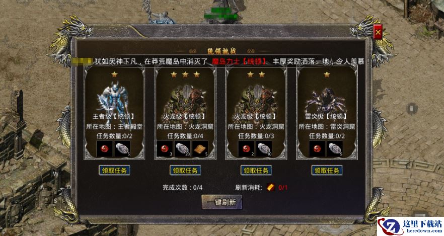 二、【日常】统领挑战:土城NPC-日常统领挑战处进行挑战,每日有4次挑战机会,前往消灭指定统领怪物完成挑战,挑战任务按照任奖励、统领级别和击杀怪物数量的不同分为1星、2星和3星,其分别是火龙珠*1 荣誉之证*5(1星)、火龙珠*2 荣誉之证*10(2星)、火龙珠*3 荣誉之证*20 技能书页*5或金刚石*1(3星),因此建议挑战3星的统领任务,若无3星任务时,可使用挑战刷新符刷新任务列表,刷新符可使用传奇币和元宝购买;
