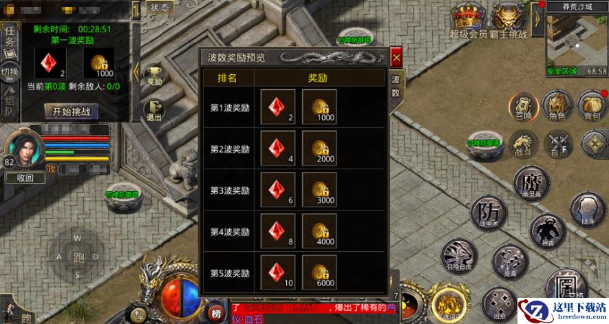 三、【守卫】守卫沙城:任务开启时间为开服8天后,每日仅限挑战一次,挑战分为10波敌人,并且每一波敌人的数量都不同,玩家可召唤防御塔来协助保护沙巴克皇宫,最多可召唤10座防御塔,挑战结束根据守卫波次来获取不同数量的传奇币和火龙碎片;