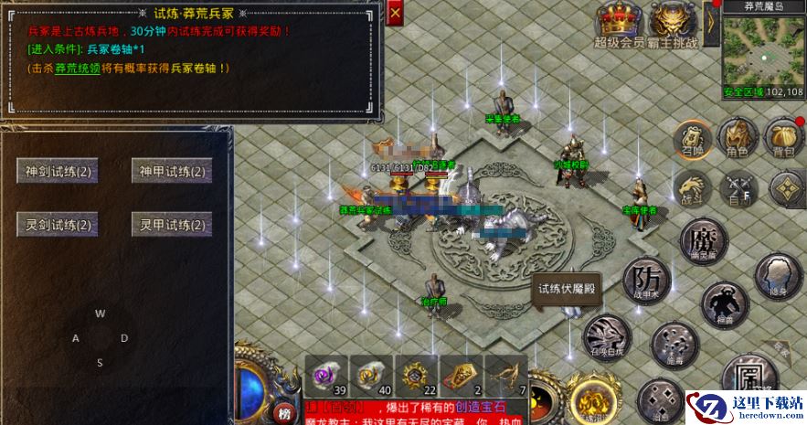 五、【试练】莽荒兵冢试练:开服5天后,消耗兵冢卷轴即可进入,试练分为神剑、神甲、灵剑和灵甲试练,各有两次试练次数,进入试练击杀怪物直至通关,每次试练奖励分别为神剑之魂*20、神甲之魂*20、灵剑之魂*20和灵甲之魂*20,也可花费20元宝双倍领取。获取的材料用于在土城神剑进化和神甲进化处升级神器;