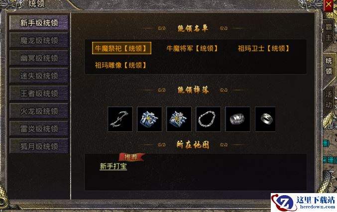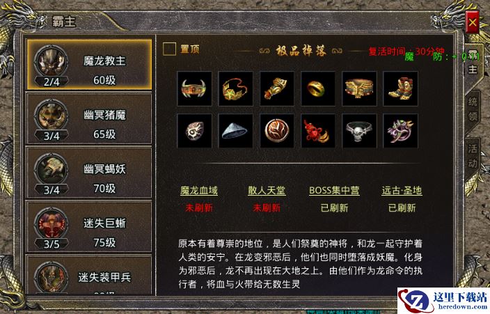 在前期除了可以升级之外,还有就是要多打打霸主级别的怪或者首领级别的怪(尤其是转生图火龙洞窟和雷炎魔窟),这些怪的具体位置都可以在霸主挑战那里或者进入相关图查看小地图便可以看到位置: