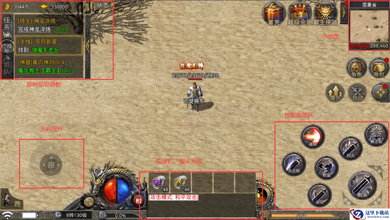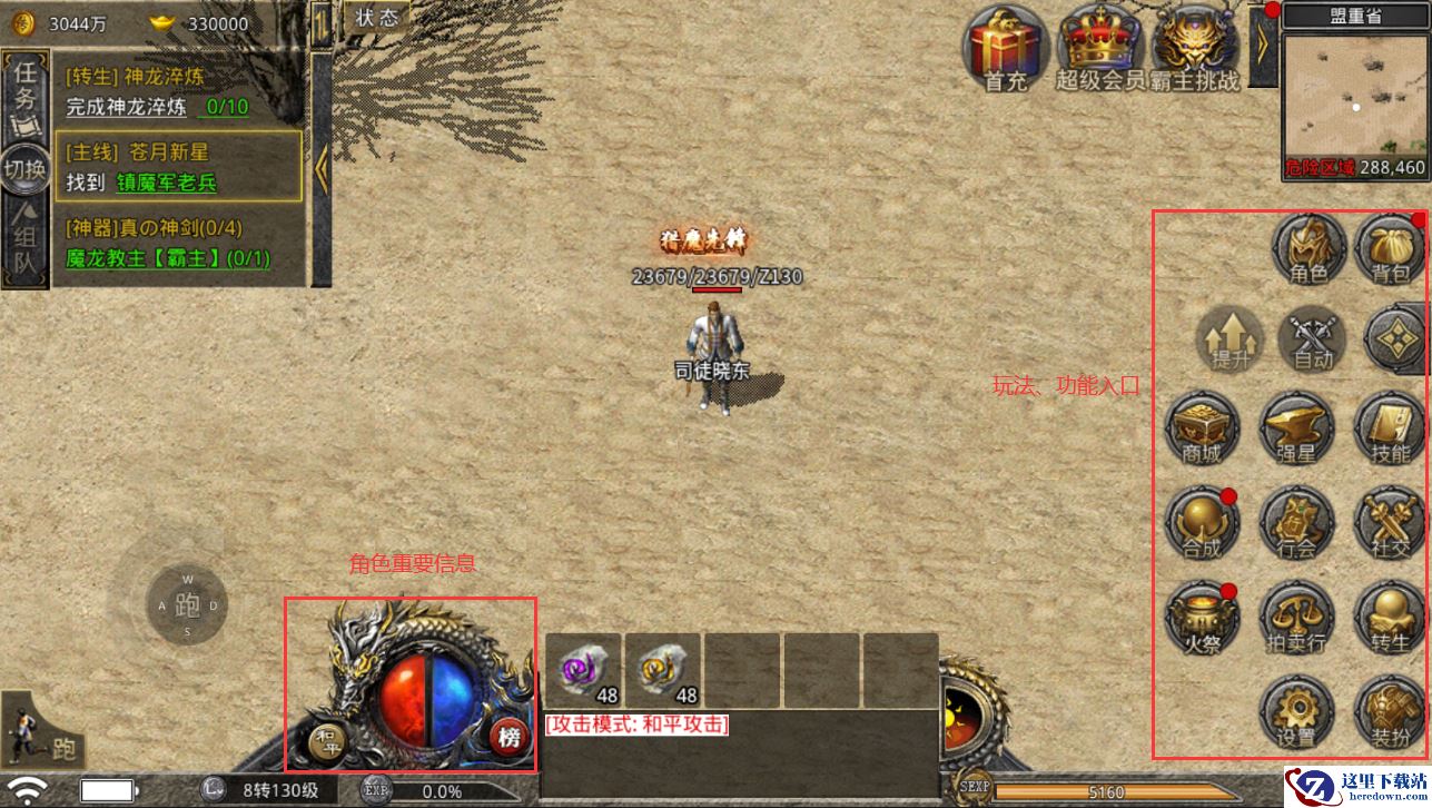 6.角色重要属性:包括物品快捷使用栏,世界聊天,角色实时HP和MP,战斗模式切换,排行榜查看,等级经验条以及火龙珠标识。