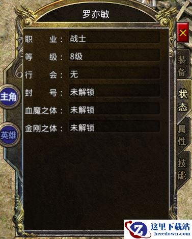 (1)玩家可以通过主界面“角色”按钮打开角色界面。页面可切换,显示装备、状态、技能、属性信息