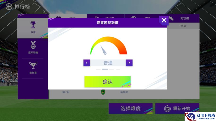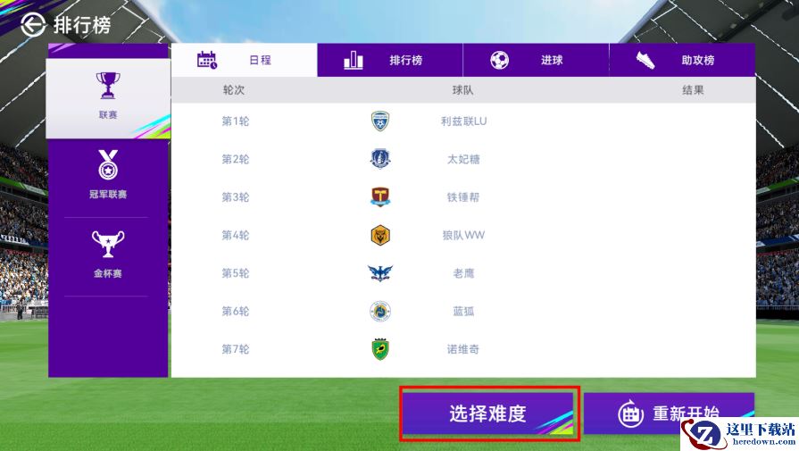 可以自由选择自己想踢的联赛以及难度,有简单-普通-困难-挑战4个难度的自选人机,人机难度越高奖励越多,新手还是建议大家选择默认普通模式,这里不建议选择简单模式,因为简单模式所奖励的经验/欧元/荣耀点数都会减少10%,而且普通模式对新手来说也不会难,后面也可以根据自身实力逐级挑战难度更高的模式。