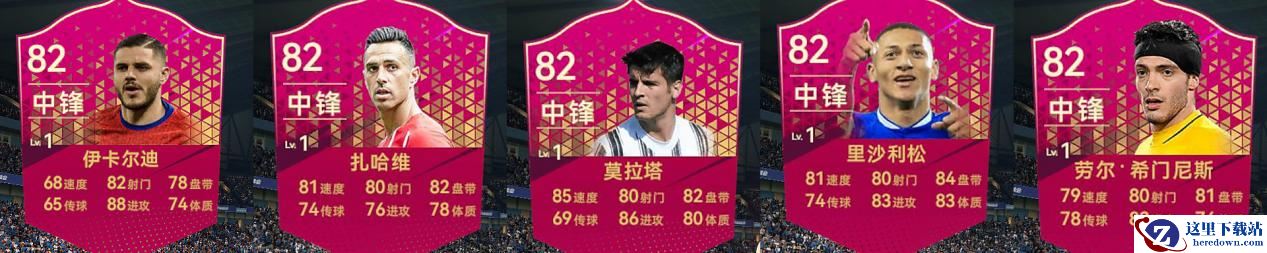 红卡的数值范围是77-82,所以新手引导过后,送的中锋是红卡数值最高的,还算可以。五个前锋中比较推荐里沙利松和莫拉塔吧,不过有了黑卡前锋,红卡都要放冷板凳凉凉了