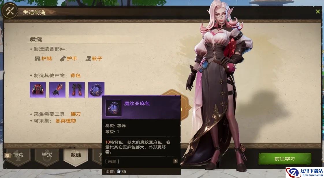 裁缝:能制作的三种装备分别是护腿,护手,鞋子另外能制作的道具是背包,背包是加背包格子或者仓库格子数量的,前期能卖点,后期不值钱,可以采集各类植物材料这个生活技能不太推荐。