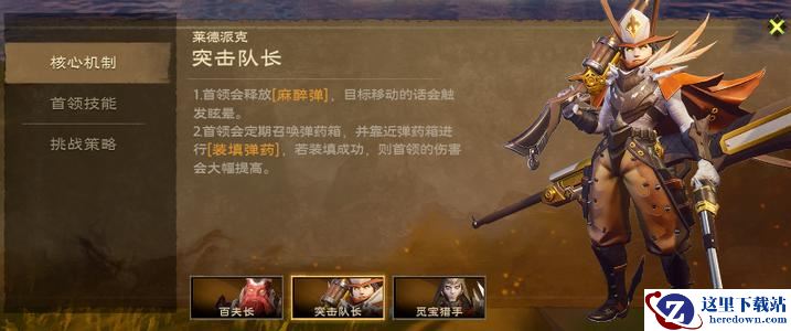 麻醉弹:首领向距离最远的玩家发射一枚麻醉弹,:造成少量伤害,并会让该玩家进入麻醉状态,移动会使玩家陷入昏迷状态。