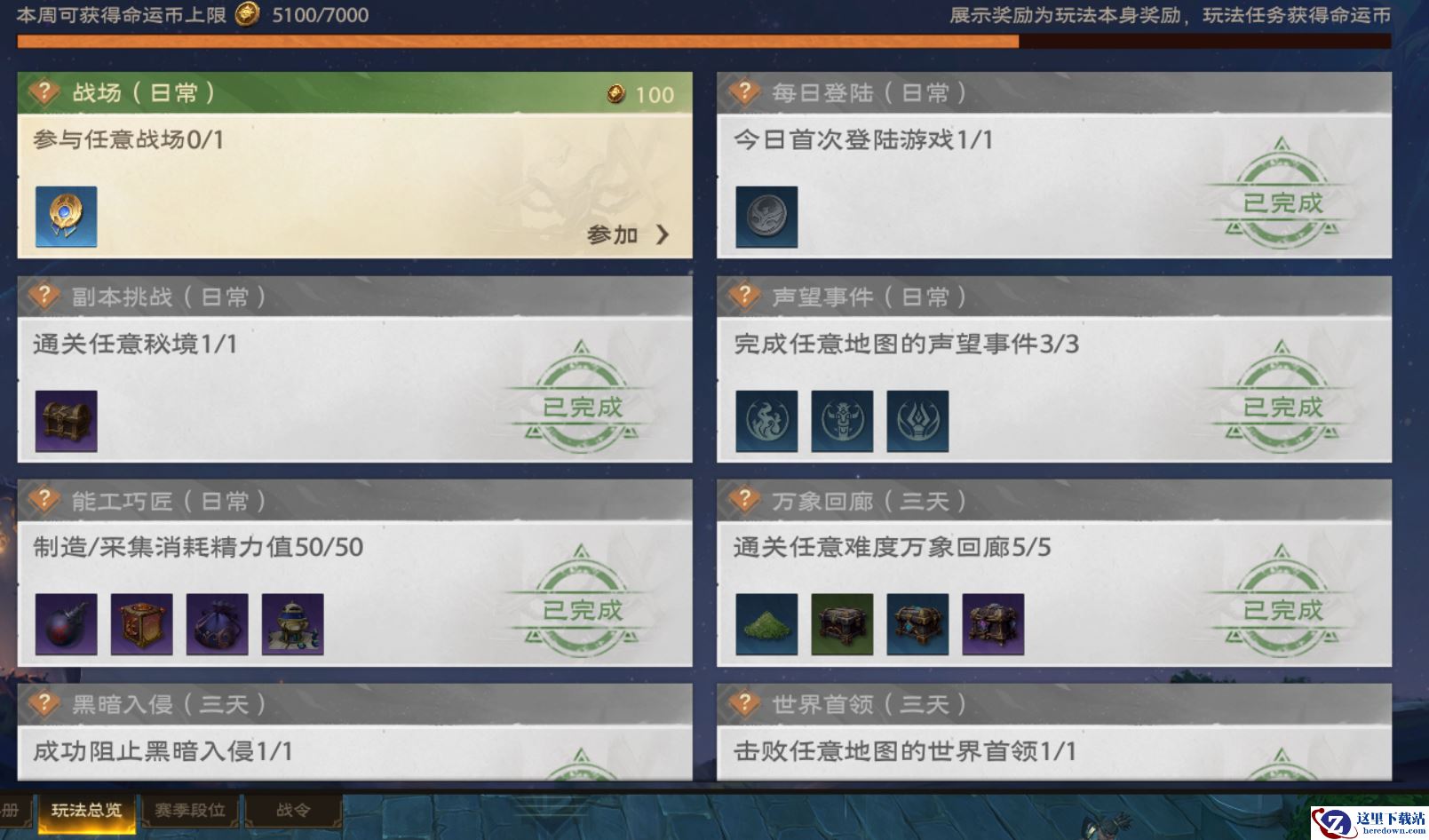 2. 赛季-玩法总览,每天花1小时可以全部做完,推荐必做,获得大量命运币,可以去命运手册商店换很多养成道具