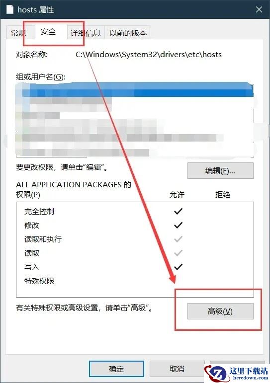 1、右键Hosts选择属性,在打开的窗口中选择“安全”并点击“高级”。