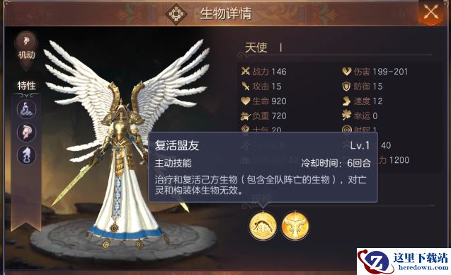 天使,圣堂顶级兵种。天使作为圣堂种族最高阶机动型兵种,拥有非常恐怖的属性与技能。主动技能复活盟友,可以复活一个死去的部队,并且对其进行治疗。(被动技能超级强,免疫一切负面BUFF)