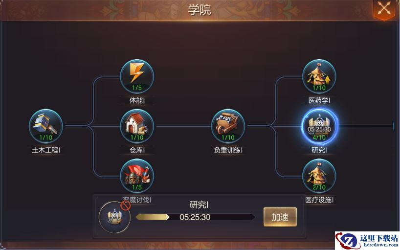 学院研究:前期大家最好选择发展里面的研究,前期PK较少,快速发展建筑尤其重要。优先点发展天赋可以加快过渡前期等级,发展中的研究可以提升研究速度,一定要优先升级哦~