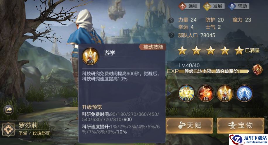 每个英雄都有不同的三个天赋,可以根据自己的选择来培养。发展比较好用的英雄,不得不提到罗莎莉。罗莎莉天赋点满可以增加10%的速度以及900秒的科技免费时间,是前期促进发展的必备良将~