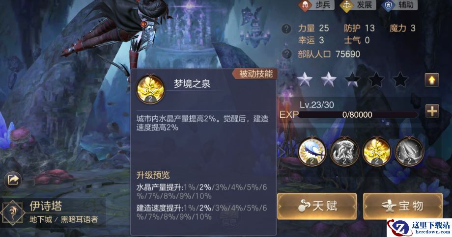 另一个是我们的紫色英雄伊诗塔,也是比较容易获得的英雄,可以适当升级解锁加快建筑速度的被动天赋,用来加速建筑升级,是性价比极高的新手英雄。