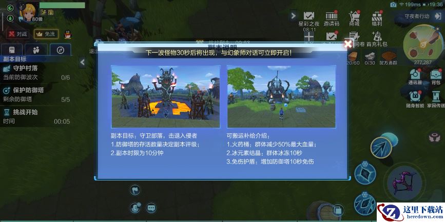 在游戏中,需要守住6波攻击,并保护5个守护塔,副本时限为10分钟,按村民存活数量评级,在副本中有部分可搬运物(陷阱)有3种。