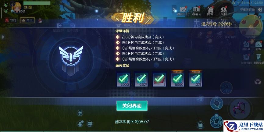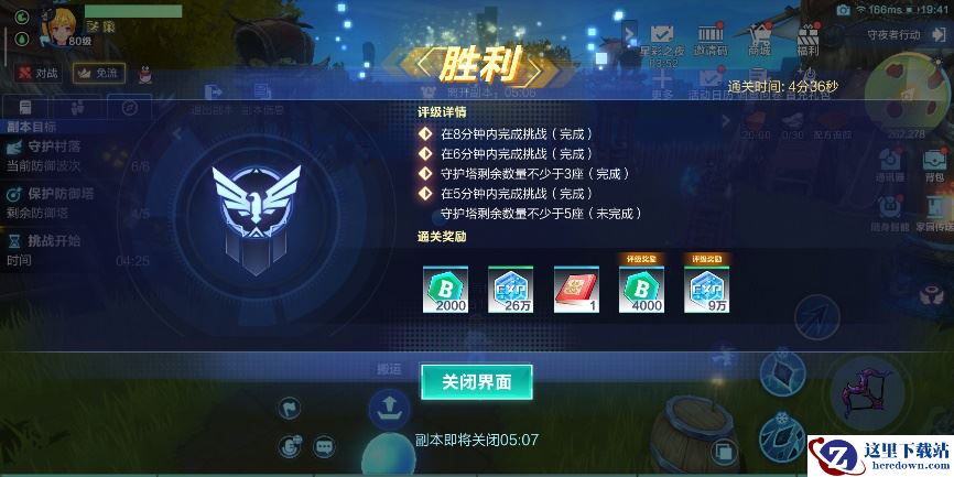 10分钟后或击败6波后,就会弹出这样的胜利,获得大量经验·比特以及驯兽指南,完成副本多个评级指标,可以获得更多的经验,这是我随便打的守夜者行动副本。
