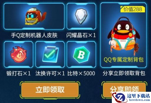 汰换许可*1、手Q机器人皮肤*1、锻打石*1、闪耀晶石*1、比特*5000