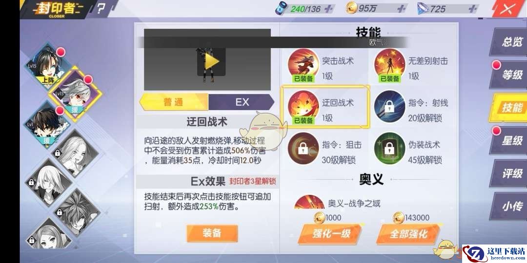 3.迂回战术:向沿途的敌人发射燃烧弹,移动过程中不会受到伤害,累计造成510%伤害,能量消耗35点,冷却时间12秒。
