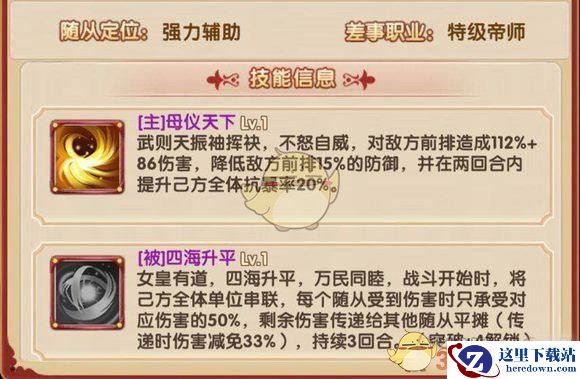 二技能四海升平是一个开局释放持续三个回合的技能,分担受到伤害的50%在减免33%后平均传递给全体(该伤害不可被闪避,不好意思我没找到养花木兰和武则天的号,免疫效果你们自己测试吧)。