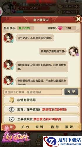 和皇上聊天勾搭,只是初阶小妃子的伎俩罢了。随着和同皇上互动日增,与皇上的好感度等级也在不断的上升,互动方式也随着升级。只有你们之间的关系跨越了界限,才能有更亲密的行为不是么?当好感度等级提升后,你能使用调戏、送礼、请求召见等更厉害的手段博得皇上的欢心,得到皇上的心是指日可待了呀。
