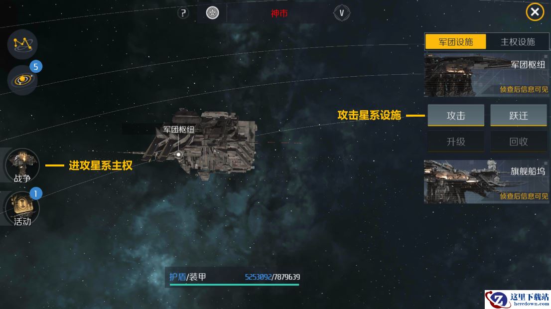 宣战的入口位于军团星图中:从军团星图中找到想要宣战的恒星系并进入星系星图,界面左侧的战争按钮对应进攻主权的战争,而右侧具体设施下的按钮则对应攻击设施的战争: