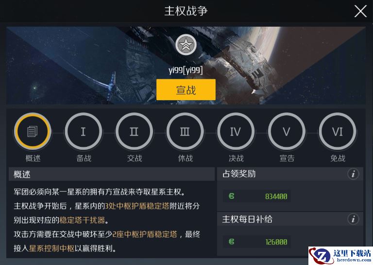 在宣战主权时,系统会弹出详情面板向玩家确认战争的阶段教学及战争胜利后这个星系能为军团带来多少奖励点收益: