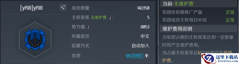 这里需要注意的是:军团拥有的主权数量并非多多益善,这是因为主权数量的增加会为军团带来一笔名为“维护费”的开支,这笔开支虽然不会克扣军团账户,但却会影响精炼厂的产量和主权每日产出的奖励点数。在军团界面的首页可以确认军团目前已占领的星系数量和维护费级别: