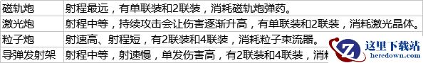 目前版本武器主要分为:磁轨炮、粒子炮、激光和导弹发射架,四种武器有各自的特点: