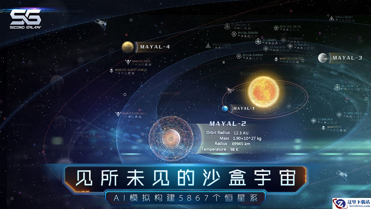 《第二银河》的宇宙世界,模拟构建了5867个恒星系(并保留继续拓展的空间),含有行星、恒星、气体、尘埃、暗物质、暗能量等各种天体,是具有沙盒要素的开放性游戏世界。