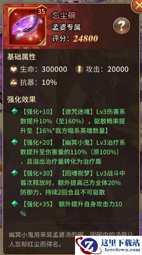 孟婆攻击提高40%,生命提高20%,速度提高15;回合开始时,孟婆20%概率为己方全体英雄附加[回魂]效果,对暗系英雄附加概率提升至100%,此效果冷却4回合;