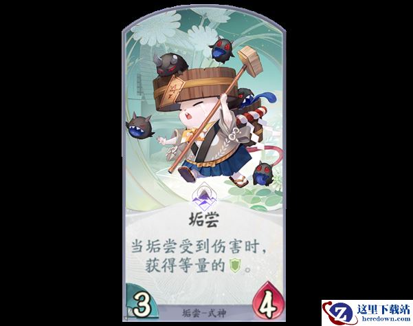 垢尝的卡牌效果主要围绕护甲展开。受到伤害后获得等量护甲赋予了垢尝优秀的站场能力,此外,垢尝对高进攻频率的式神也有着强大的抵抗能力。