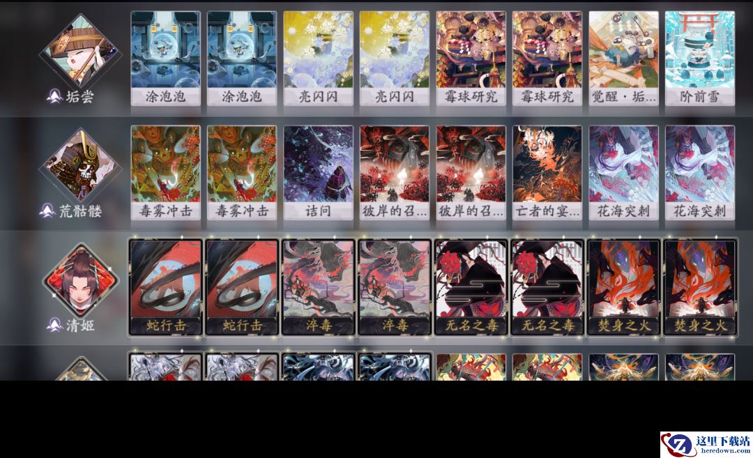 涂泡泡和白刃都是可以瞬发的战斗牌,在1勾阶段也不必纠结瞬发效果,抢到伤害才是硬道理。同时相比之前的卡组,荒骷髅的加入与清姬形成了多一些的AOE输出,比如毒雾冲击+淬毒,增加了一些打击后排式神的手段。