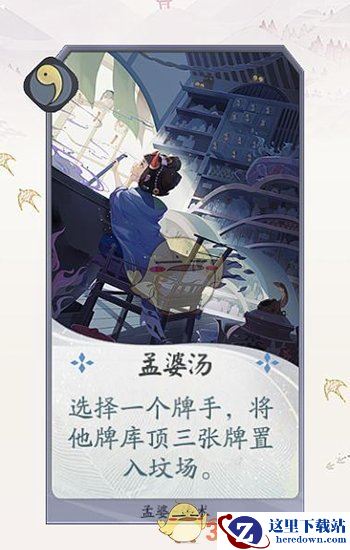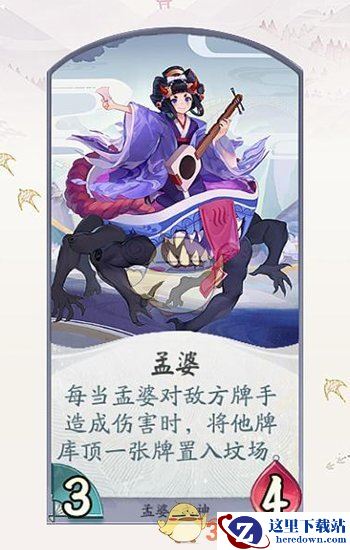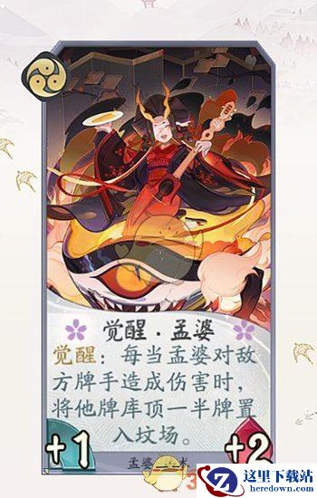 【觉醒】:每当孟婆对敌方牌手造成伤害时,将他牌库顶一半牌置入坟场。