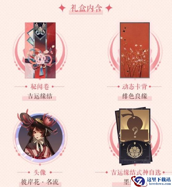 礼盒含「彼岸花·名流」头像、「绯色良缘」动态卡背和吉运缘结自选式神全套墨染牌框。