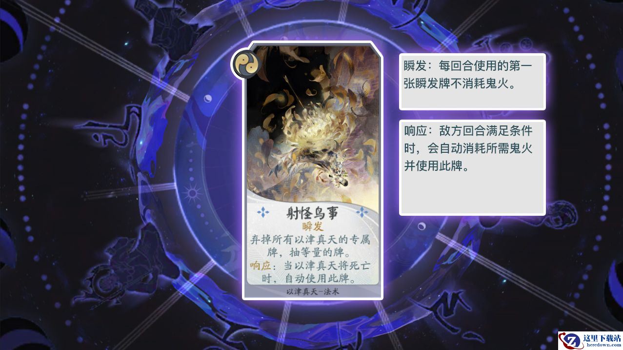 卡牌作用:可以在以津真天将死亡时,弃掉所有以津真天的专属牌,重新抽等量的牌,增加了存活式神的卡牌,减少卡手情况,但若是以津真天为核心的卡组,弃掉她的专属牌,反而对己方不利,建议客人明确定位后再决定是否携带。