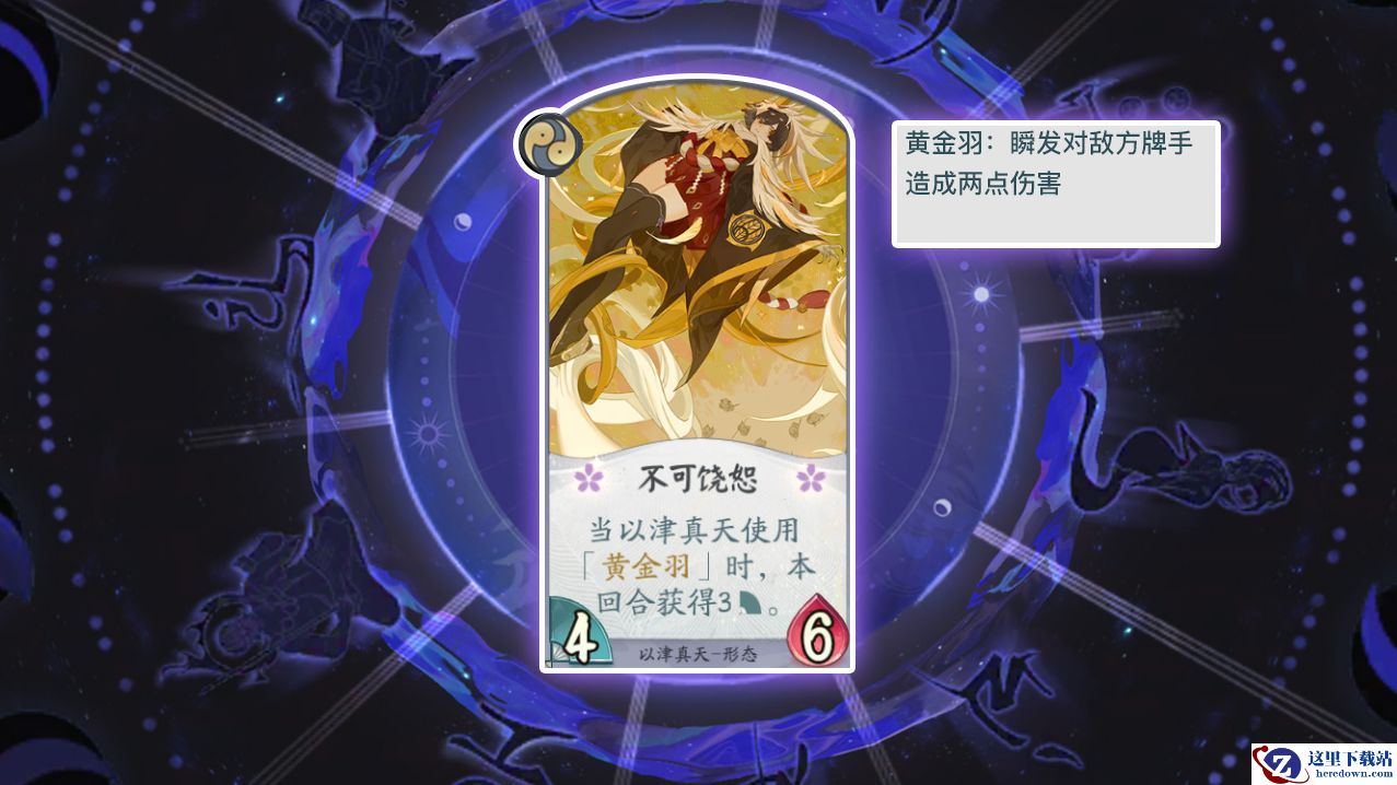 卡牌作用:是一张,依靠使用“黄金羽”来增强能力的形态卡牌,在以津真天使用“黄金羽”后,本回合获得3点力量,加上本身就有的4点力量,7点力量值能够打出不俗的伤害。配合“金风流羽”还可以一回合内爆发出高额伤害,时机合适时还可以用来收割对手。
