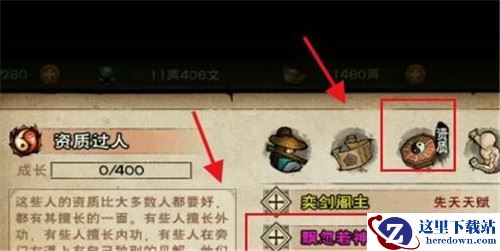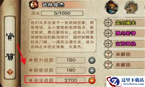 4、然后点击身法资质进行调整数值,再开启先天天赋,选定解锁。
